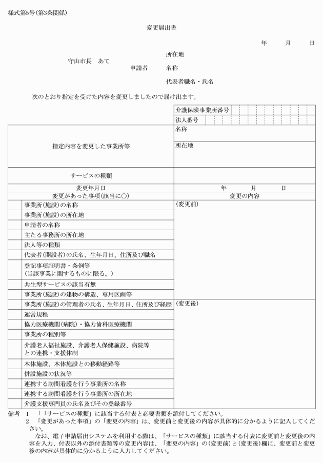 第3条 指定事業者は、当該指定事業所の名称および所在地その他厚生労働省令で定める事項の変更があったときは、変更届出書(別記様式第5号)を市長に提出しなければならない。