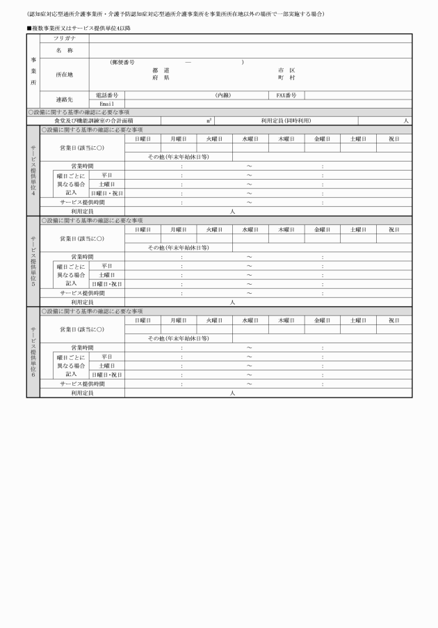 法第8条第18項に規定する認知症対応型通所介護および法第8条の2第13項に規定する介護予防認知症対応型通所介護(共用型) | 認知症対応型通所介護事業所・介護予防認知症対応型通所介護事業所の指定等に係る記載事項(共用型)(別記様式第15号) |